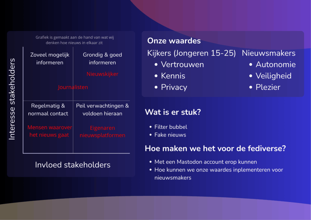 Bij design heb ik onderzocht in groepsverband hoe nieuws platforms in elkaar zitten en hoe dat beter zou kunnen. Wij deden dat aan de hand van de publieke waarden. Samen maakten en een ontwerp voor een nieuw nieuwsplatform dat gekoppeld is aan de fediverse, gericht op nieuwsmakers en jongeren tussen de 15 en 25 jaar oud. We hebben onderzoek gedaan door te kijken naar bestaande nieuwsplatform en keken naar de problemen die ze zouden kunnen hebben zoals nepnieuws, objectiviteit en onveiligheid. Aan de hand van interviews bij onze doelgroep hebben we inzicht gekregen in wat belangrijk is om mee te nemen in ons eigen design.