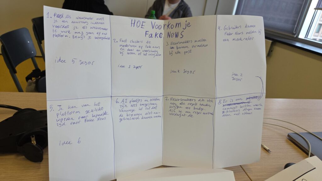 Bij ideation hebben we met het team de crazy 8 gebruikt om op ideeen te komen over hoe je fake nieuws kan voorkomen. We hebben gekeken naar verschillende manieren om dat op te lossen. De crazy 8 is een erg fijne maar wel stressvolle manier om op ideeen te komen, omdat je weinig tijd hebt per idee en het maar snel doorgaat. Maar door die tijdsdruk kom je soms op ideeen die je eerder zelf niet zou verzinnen.
